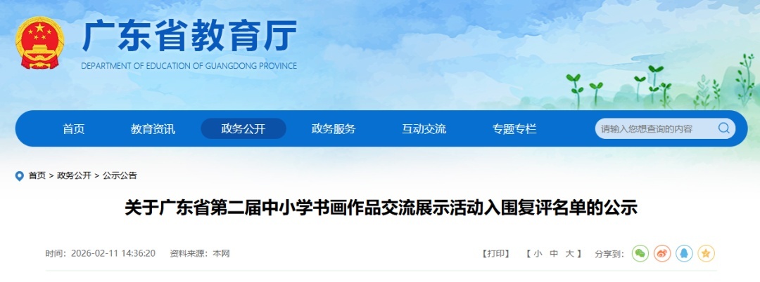 根据《广东省教育厅关于举办广东省第二届中小学书画作品交流展示活动的通知》要求,省教育厅组织专家评审,确定1910件作品入围复评。现对入围复评名单公示,公示时间为2026年2月11日至2026年2月24日。如对入围名单有异议,请在公示期内向省教育厅体育卫生与艺术教育处反映。
