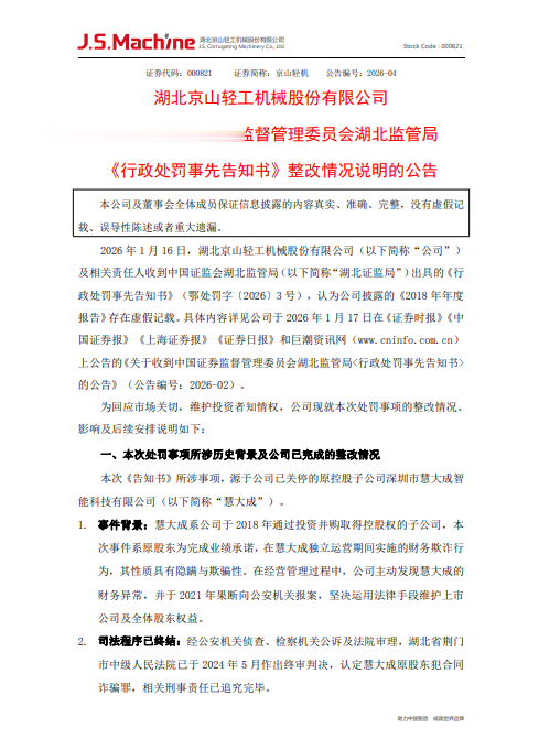 由于此次行政处罚,公司股票将自2026年1月19日停牌1天,自2026年1月20日复牌。并从复牌之日起被实施其他风险警示,股票简称将由“京山轻机”变更为“ST京机”,交易日涨跌幅限制由10%变为5%。